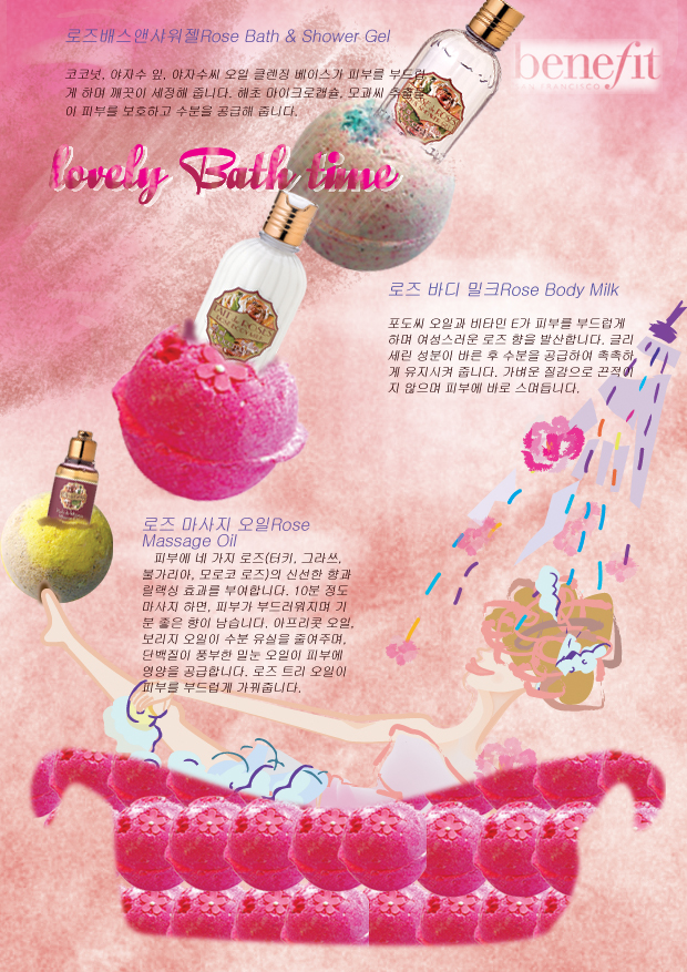 깔끔하지않은 일러스트에 합성된 욕조...... (죄송) 일러스트와 포토가 완벽해보이지 않아성 ㅜㅜ 성의 없어 보일수도 있지 않을까요??? 화장품은 제품이 우선입니다.... ㅡㅡ 목욕용품이라면..... 이 페이지가 목욕공간^^ 목욕탕이 되는거져....ㅎ 배경을 털어서? 거품이 덩어리... 아래에 무게를 실코... 욕조에서 나온 거품들이 물방울느낌으로...퍼지면서..... 상단에 제품들이 물방울과 함께 정리되면 .... 어떨란지요?? 저도 잘은 모르겠습니다만.... 님의 노력과 도전에 많은 가능성을 느껴 봅니당 ㅎㅎ